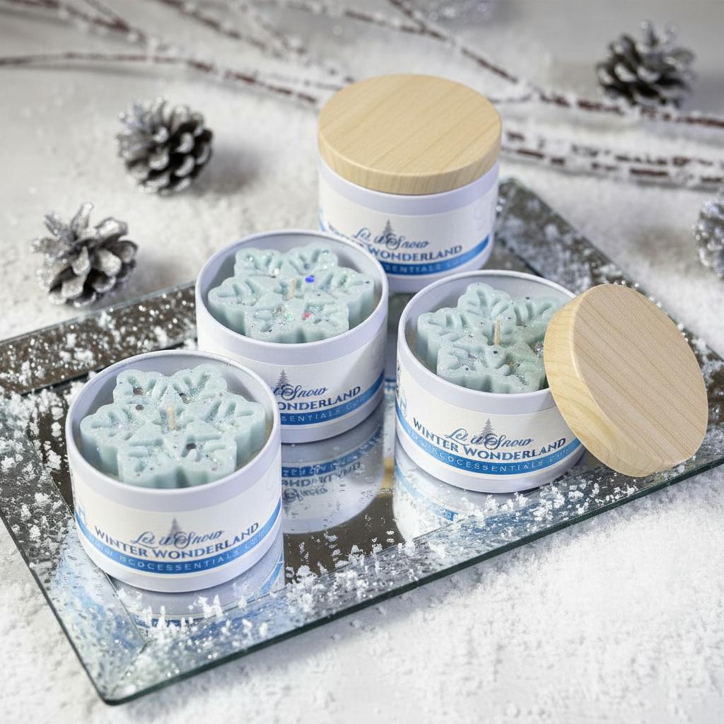 Bring the magic of a peaceful snowy evening indoors with this charming 4 oz candle tin. Let It Snow is scented with Sparkling Winter fragrance with Hints of vanilla, cedarwood, spiced cinnamon, a touch of peppermint, and crisp pine needles create a scent that feels like taking a deep breath on a quiet winter night.